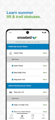 The official app of Snowbird. Hold all the Snowbird summer information at your fingertips. Real-time lift & trail status, weather data, live webcam feeds, summer activity status, summer trail map and more.