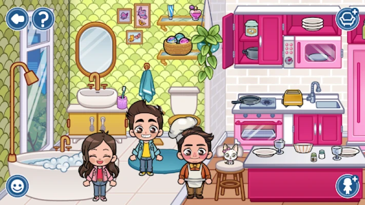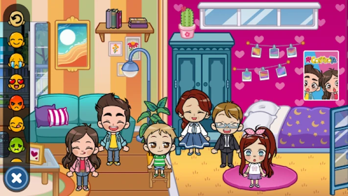 Furnish the different rooms of your home: choose the floor you prefer from the types available; decorate the walls with wallpaper or other decorations, or paint them choosing from 50 shades of colors. Place your characters within the environments and interact to create unique stories.