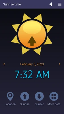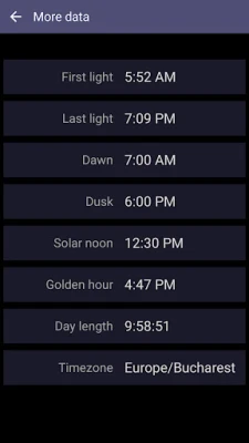 This easy-to-use app accurately computes the sunrise and sunset times based on your current location and current day of the year. Also, it can show those solar times for yesterday and tomorrow if you tap the left or, respectively, right arrow buttons. Solaris works on tablets and smartphones connected to the Internet. At first, it gets the local coordinates (latitude and longitude) from your device's GPS and then retrieves the solar data from an Internet server. In addition to the time values we already mentioned, our app also reads the First and Last Light times, Dawn and Dusk moments, Solar Noon, Golden Hour, and Day Length and shows them when you tap the four-dots button.