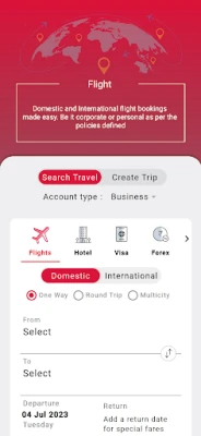 Employees can seamlessly search and book flights, hotels, buses, travel insurance, cabs, visas, forex, and rail—all within the company policies and approval workflows. The app also supports amendments like reschedules or cancellations when plans change, ensuring every aspect of corporate travel is covered.