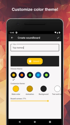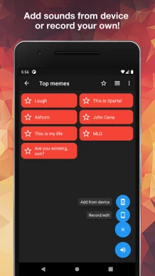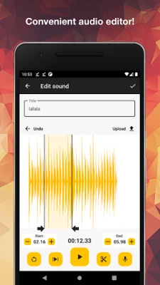 - Ability to customize the color theme for the soundboard! - A handy audio editor to tweak and trim sounds! - Play multiple sounds at the same time! - Add sounds from your device or record your own! - Support for different audio formats!