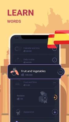 Learning Spanish can be fast with our special repetition system! Immerse yourself in a language adventure, adding new words to your vocabulary every day. Improve your Spanish verbs and Spanish pronunciation, and explore interesting topics. There are 20 topics + a test for all levels.