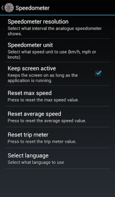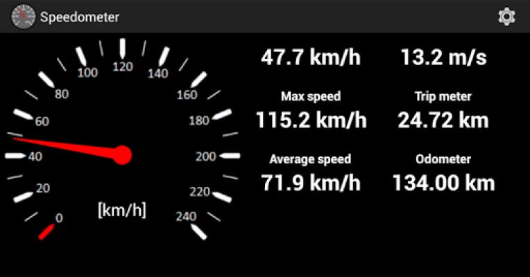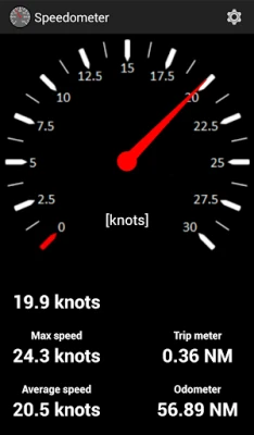 * Analogue and digital speedometer. * Choose from four different speedometer resolutions for the analogue gauge: 0-30, 0-60, 0-120 or 0-240 speed units. * The speed can be displayed in one of three different units: kilometers per hour (km/h), miles per hour (mph) or knots (nautical miles per hour). * When unit km/h is selected the speed in m/s (meter/second) is also displayed. * When unit mph is selected the speed in fps (feet per second) is also displayed. * Max speed * Average speed * Tripmeter * Odometer * Possibility to pause the meters by a "long click" on the screen.
