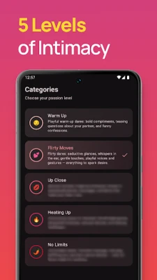 Choose your comfort zone and gradually increase the heat! The game features five carefully designed categories arranged by increasing intimacy: