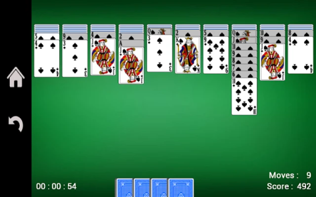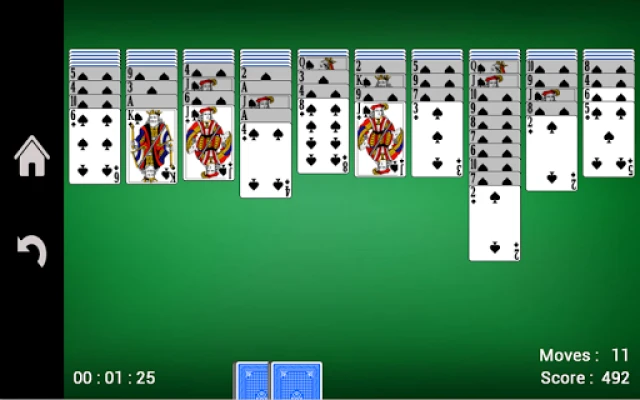 You can move a card to an empty column, or on a greater card (whatever the color). But you can only move a set of cards provided the cards have the same color and the correct order. A complete suit of cards gets automatically removed. At any time, player can use the remaining stack to add cards on all columns.