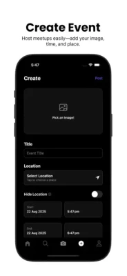 • Share your own events and make them visible to friends or everyone nearby.