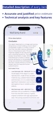 Save time, avoid endless research, and get reliable descriptions and estimates for all types of objects, wherever you are. Whether you're selling, buying, or simply satisfying your curiosity, Sprice-it is your evaluation assistant.
