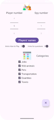 Choose the number of players and spies and their names. Also, select the categories (check them all or the ones that interest you).