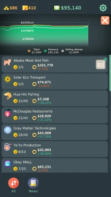 Buy shares in the most promising startups - earn dividends and create international holdings! Open new districts, pump up and grow your companies. Set up production, improve processes, invest in marketing and advertising. All of this will pay you even more dividends!
