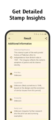 The user can share the result of the identified stamp. The information is in text format, and there is a share button on the result screen.