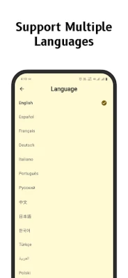 The stamp collecting app supports multiple languages, more than 10 languages. By default, the app chooses the device language if supported by the app; otherwise, English will be selected. The user can change the language in the settings screen.