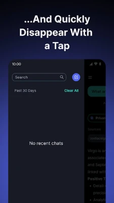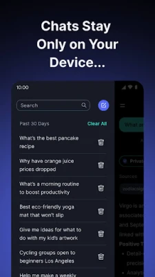 Revisit past conversations whenever you wish with our chat history feature. You can delete individual messages or clear your entire history in a single tap. Your data stays entirely under your control.