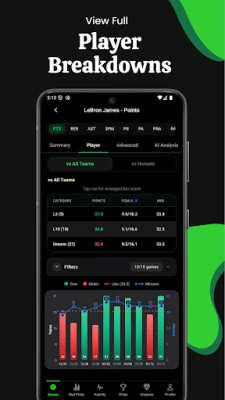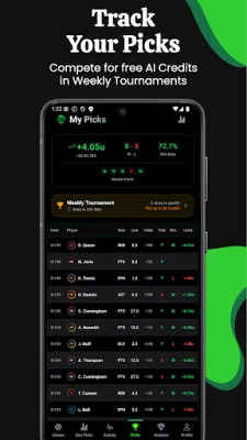 • Pick Tracking — Log your picks, track results automatically, and see your win rate, units won, and performance by stat type. Know what's working and what isn't. Compete in Weekly Tournaments for free AI credits.