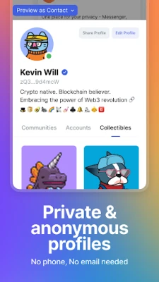 ✓ Anonymous user profiles: No phone number, email, or bank account required to create a Status profile.