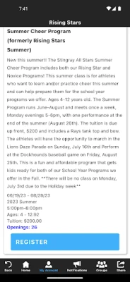 The Stingrays Wisconsin app allows you to manage your account with ease, register for classes, camps, special events, and tryouts. You'll also receive important notifications about class changes, closings, registration openings, special announcements, and upcoming events.