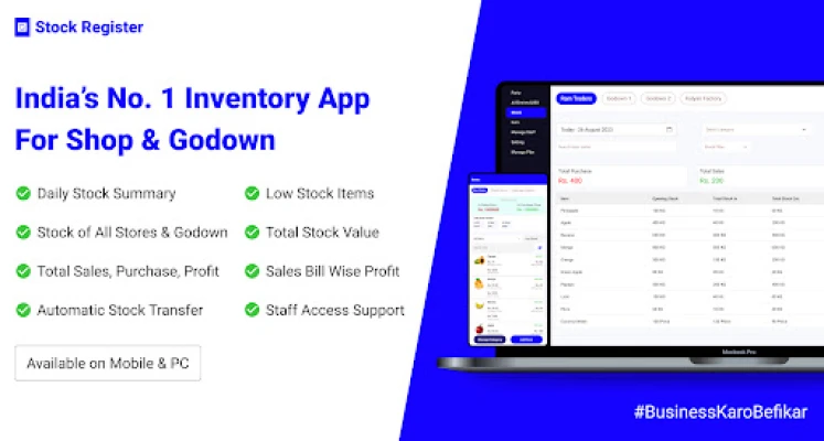 Godown stock record software. Stock Register is a shop, godown stock maintain app, billing app to track the opening stock, available inventory item list, total stock in, total stock out. Replace your sale purchase stock register, bill book with this shop, godown stock record software to track available inventory on your mobile. Use Stock Register as Vyapar App to track the available inventory item list for all sites, stores, and godowns. Stock Register app replaces aavak javak book, inventory app for efficient shop & godown stock management.