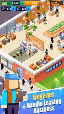 Start with a small storage unit,and work on it to make it grow. Open new area to build more kinds of storages. Storages of different sizes and functions can be provided to customers!