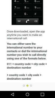 - Save the international destination as a contact and then just select the contact within the app to make the call. Or just dial the international number 011-country code + city code + phone number within the application.
