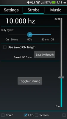 The primary feature of this app though is its extremely accurate stroboscope ability. Uses include everything from checking the RPM of your car engine, to calibrating a record turntable, and even to finding the speed of a spinning fan. With millisecond accuracy and adjustable duty cycle, spinning objects can be made to appear stationary.