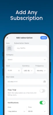 - Smart renewal reminders on your schedule: choose 1 day, 3 days, or 1 week before the next billing cycle.