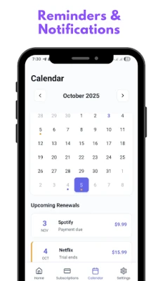 Bill Calendar & Reminders: View upcoming due dates on a built-in calendar. Customize alerts to notify you 1–7 days before each charge so no bill or renewal slips by you.