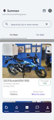 One of the areas Summon focuses to reach is matching delivery bike owners with drivers looking for bikes to rent, As a delivery driver you can get matched to your desired bike with a simple search, For bike owners looking to rent out their bikes, listing the bike on Summon gives owners features like, an application system on the app which helps owners filter for the most suitable driver to rent with, Reach more potential drivers to rent with by listing your bike with Summon.