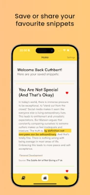Save or share the snippets which you find the most helpful to you, and check into the app every day to build a good reading habit!
