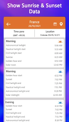 - App gives Astronomical twilight, Nautical twilight start, Civil twilight start, Sunrise, Golden hour end, and Solar noon time.