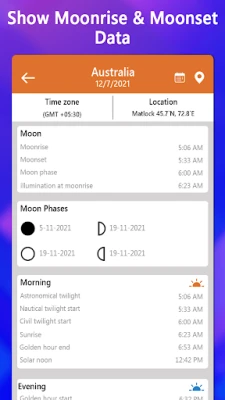 - Moonrise time, Moonset Time, Moon phase, and Illumination at moonrise.