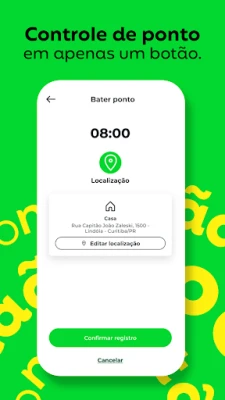 Registre sua jornada: entrada, saída, férias e folgas diretamente pelo celular, com histórico sempre disponível para consulta.