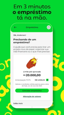 Dê um alívio no orçamento ao antecipar o Saque-Aniversário do FGTS pelo app, com praticidade e segurança. Também é possível contratar o Crédito do Trabalhador em poucos cliques, com condições acessíveis. Tudo isso direto pelo SuperApp, pra você ter ainda mais autonomia financeira.