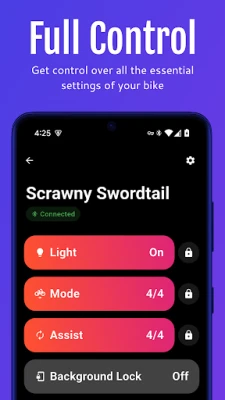 Features: - No account or internet connection required - Quickly switch between multiple bikes - Lock settings, like Mode, to automatically switch when the bike is turned on and the app is running - Background Lock, which will keep your bike on whatever settings you set it at, even the phone is locked - Open source