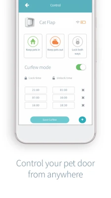 • Set a curfew routine to keep pets in at specified times during the day (one curfew per day for the Microchip Pet Door Connect or up to four curfews per day for the Microchip Cat Flap Connect).