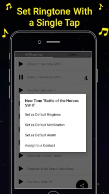 - Choose you favorite tone from SW Ringtones, click on the right corner setting button, set the tone as your new ringtone as easy in few steps!