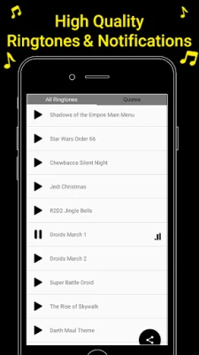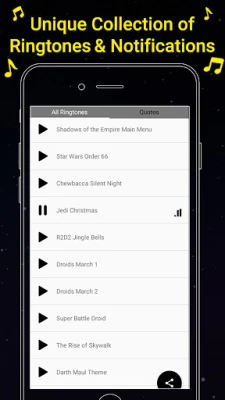 You can find many original SW Ringtones & quotes in this App. But if you looking for something different, no worries, there is also some remix version of the ringtones & SW ringtones sound effects included like Battle Alarm, Blast Door, Blasters, Cantina Band, Falcon Flyby, Falcon Landing, I Am Your Father, Imperial March, Star ⚔️ Landspeeder Accelerate, Landspeeder Decelerate, Music Asteroid Chase, Quadlaser Turret Fire, The Power Of The Dark Side, Tie Fighter Fire, Xwing Explode, Xwing Fire & more SW Ringtone...