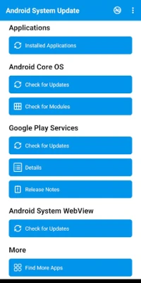 The System Update for Android application provides you with detailed information of Android system modules and installed applications in your device. The application also helps to check for updates of the essential Android System modules. You can manually check for updates or periodically receive notifications to check for updates.