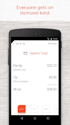 • Select which items each person ordered. Everyone with Tab on their phone can join onto the bill and select their own items – Tab keeps everything synced in real time.