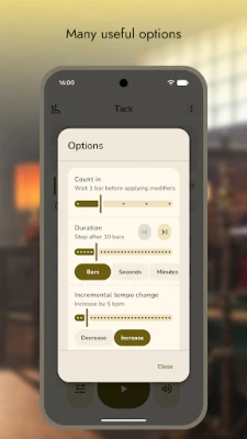 • Options for count-in, duration, incremental tempo change, muted beats, swing and polyrhythm
