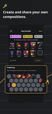 • Create your own TFT compositions and share them with your friends. Plan ahead strategies while playing the game with the composition builder, or theorycraft even if you’re not playing.