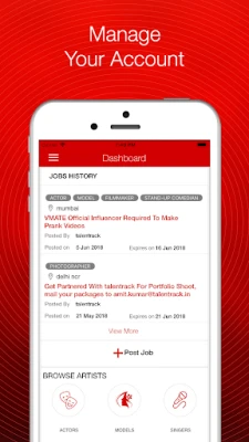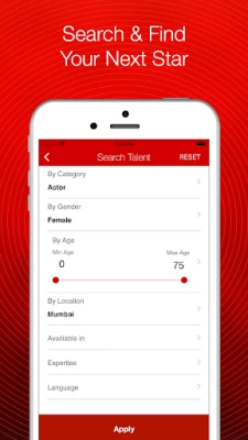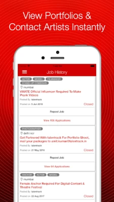 - Users can register as recruiters and can create a business profile. - Recruiters can post projects/auditions, view applications, shortlist & contact artists. - Recruiters can search artists from 14+ categories (actors, models, singers, musicians, dancers, photographers etc.) using various filtering parameters. - Recruiters can invite selected artists for auditions directly. - Get instant notifications when artists respond to your casting calls.