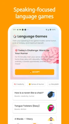🎮 Language games — develop spontaneity, storytelling, flirting, emotional expression, and the ability to handle conversations in challenging situations.
