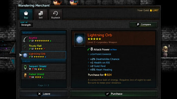 • Level up. Acquire weapons, shields, blessings, and potions to alter your character.
