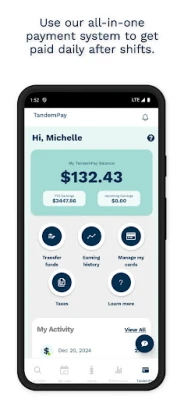 - Receive payment after shift into your TandemPay account, where you can immediately spend, save, or transfer your earnings.