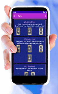 Types of Tarot: • Classic Tarot. It consists of a three-card spread that will give you the forecast for today and also offer you some advice on health. • The Path of the Day. Four-card spread to guess work, money and love for today. • The Tarot of the Couples. This love Tarot predicts the future of any couple and offers advice on how to improve their relationship. • Card of the Day. The simplest Tarot in which you choose the card that will mark your day. • Yes or No. Ask the Tarot a question for a direct and reasoned answer.