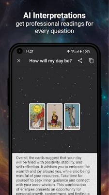 Tarot Divination provides a way to save every reading you make in your tarot journal. Come back anytime and find new aspects of the same answer. But if you forget to keep critical reading, don't be sad; the app will do this for you!