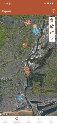- The explore tab with multiple options, choose from; satellite view, street view or offline map.