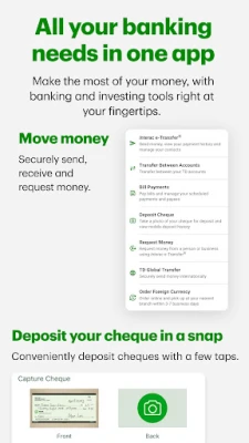 • Pay bills, deposit cheques, and manage TD Rewards.