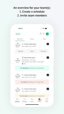 No more endless group chats or scattered schedules. Whether you’re a player, coach, or staff member: with Teamy you instantly see who is present, where to be, and what’s on the agenda—plus many handy features.