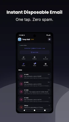 Stop giving your real email to every website. Temp Mail creates temporary email addresses in one tap — no sign-up, no personal data. Perfect for sign-ups, verifications, free trials, newsletters, and anything you don't want in your real inbox.