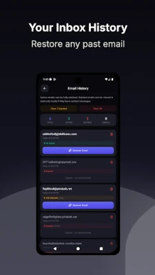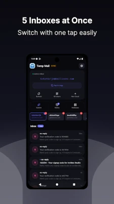 Manage up to 5 active temporary inboxes simultaneously and switch between them with a single tap.